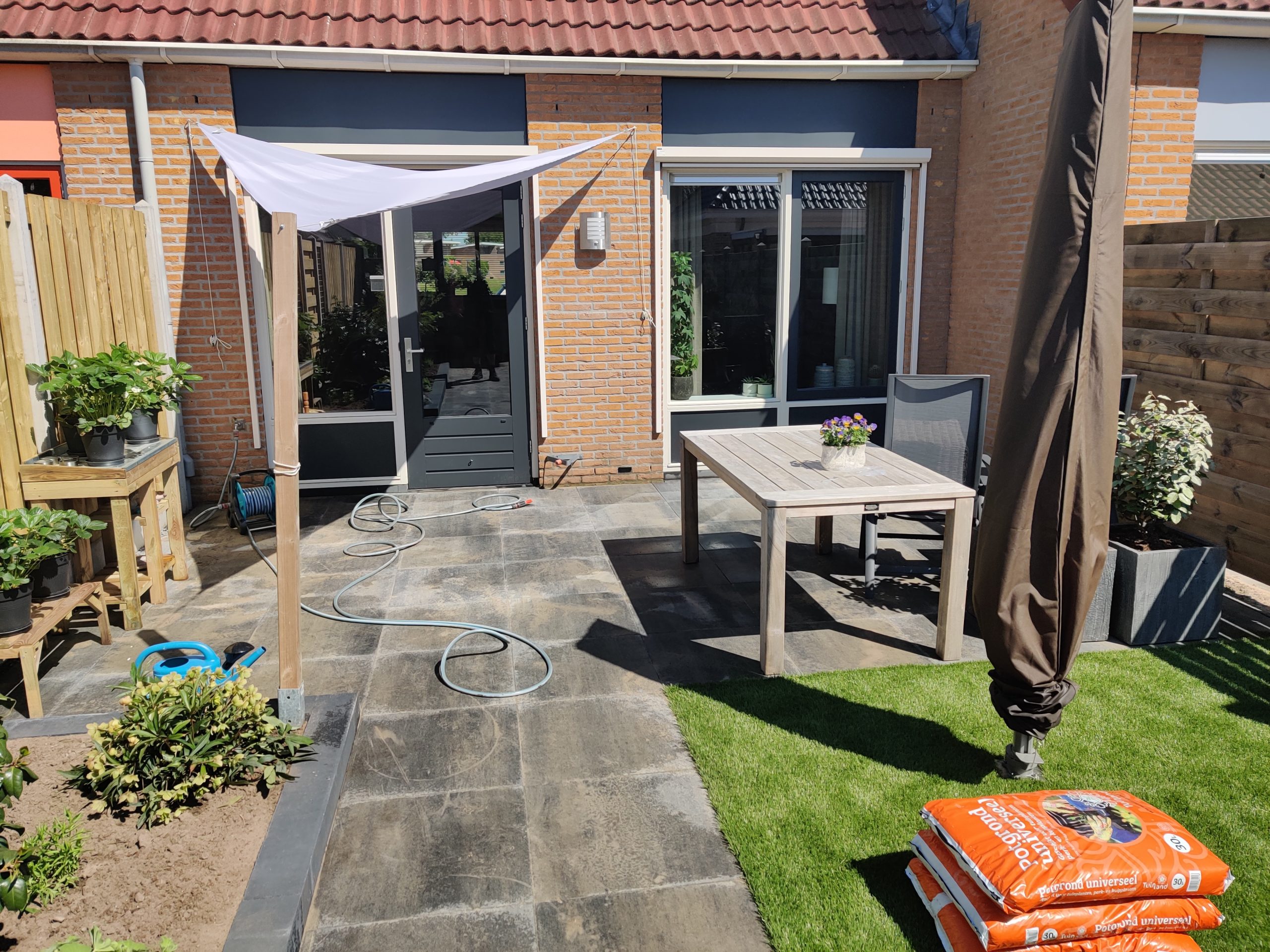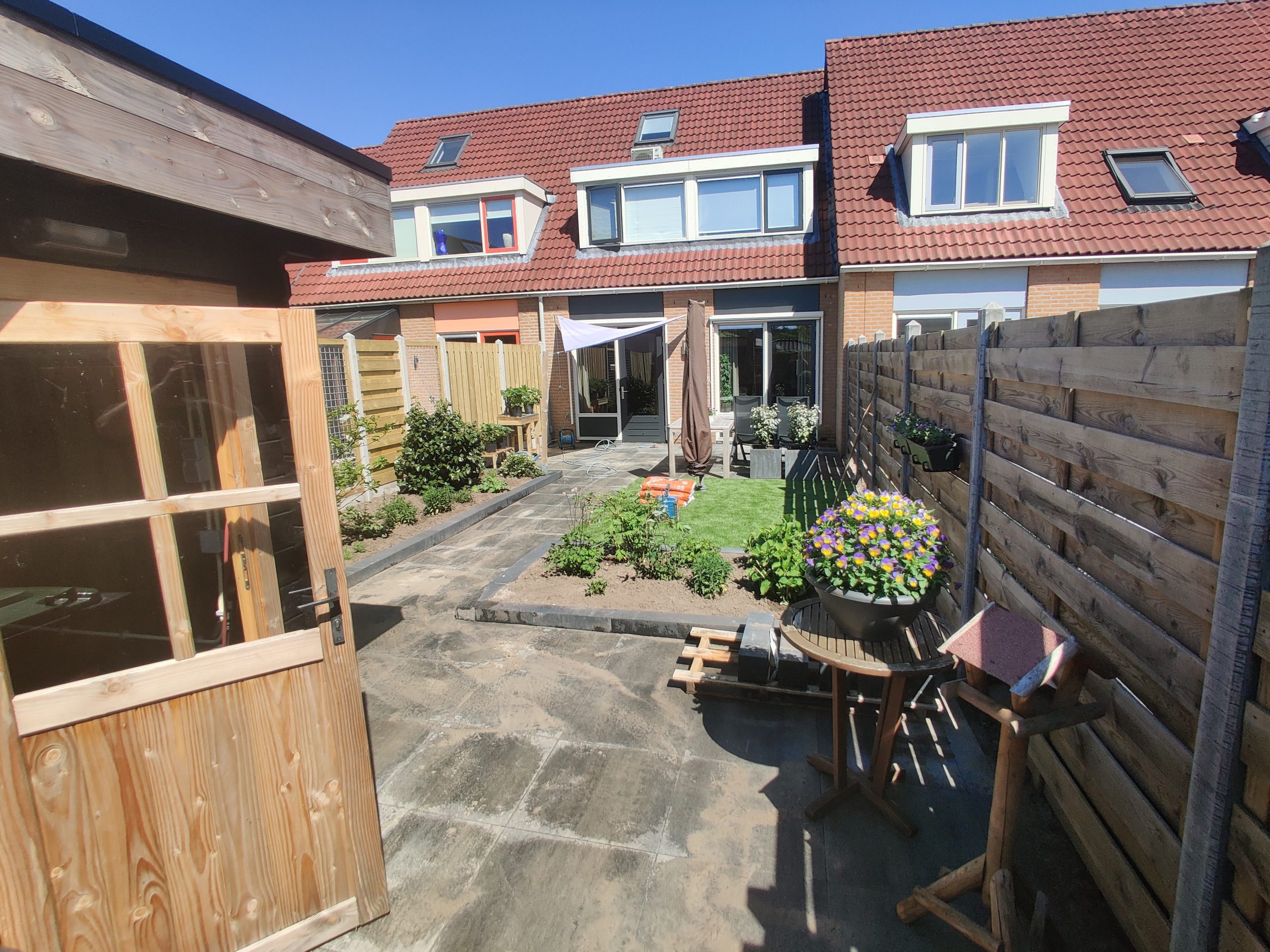 - Beplanting: vrijwel alle bestaande beplanting heeft weer een plek gevonden in de tuin, aangezien het formaat van de borders ongeveer hetzelfde is gebleven. Het gras is vervangen door kunstgras, aangezien het gazon vaak problemen gaf ondanks verticuteren, bemesting en het aanbrengen van voedingsstoffen op het gras.