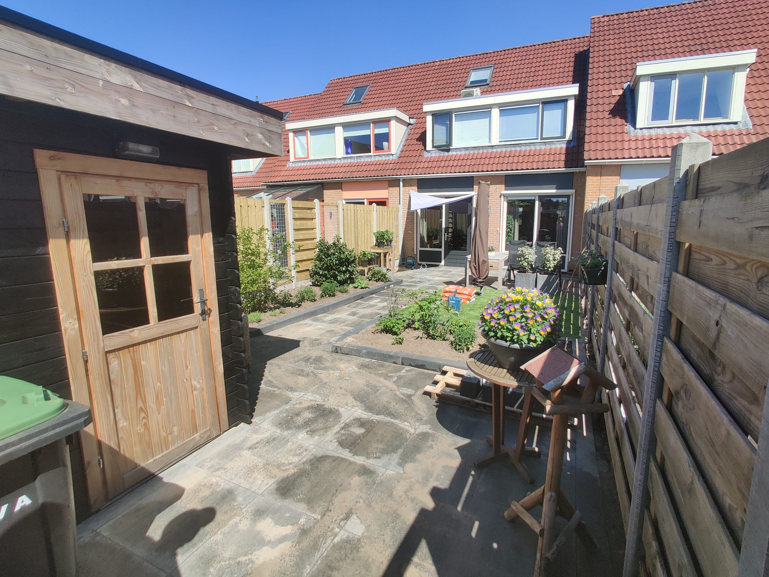 - Leeghalen: in deze tuin was oude cobblestone bestrating aanwezig. Deze is door ons al enkele keren machinaal gereinigd, maar deze waren echt aan het einde van hun levensduur. Daarnaast hebben we ook verscheidene bestaande borders afgegraven. Ook hebben wij een oude schutting verwijderd en afgevoerd.